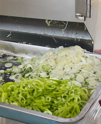 切菜機(jī)具備雙調(diào)頻功能,一端是切葉菜類,如長(zhǎng)蔥,蒜苗,韭菜,芹菜,白菜,青菜等,一端是切球根莖類,如蘿卜,土豆,紅薯,芋頭,筍,洋蔥,茄子,蘋果,生姜等。根莖部分可切片(厚薄度2-10毫米可選),根莖部分切絲(2-10mm方絲可選),根莖部分切?。?mm,10mm,12mm,15mm,20mm),葉菜部分切段切條(長(zhǎng)度1-90mm可調(diào)),具備雙調(diào)頻功能。